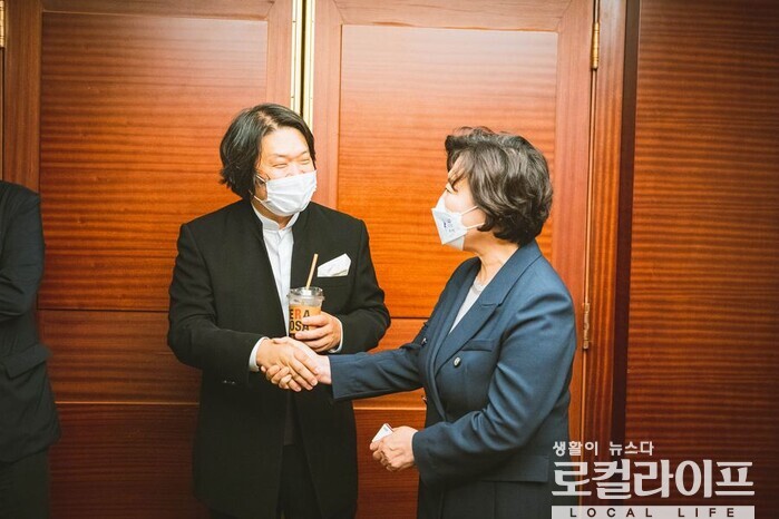 | ▲ 신계용 과천시장(오른쪽)이 서진 지휘자(왼쪽)와 인사를 나누고 있다. (사진출처=신계용 페이스북) |