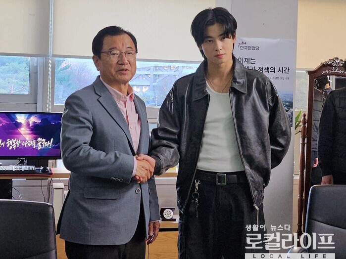 | ▲ 이현재 하남시장(왼쪽)이 촬영차 시청 집무실을 방문한 차은우 배우(오른쪽)와 인사를 나누구 있다. (사진출처=이현재 페이스북) |