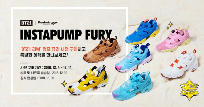 'BT21'은 지구에 불시착한 우주 생명체 타타와 반이, 알제이, 치미, 쿠키, 망, 슈키, 코야를 만나 우주 최고의 스타를 꿈꾸는 그룹 BT21을 만들게 된다는 스토리를 지닌 캐릭터이다. 리복은 이 중 타타, 알제이, 치미, 쿠키, 망, 슈키, 코야 7가지 캐릭터를 활용해 인스타 펌프 퓨리 7종을 새롭게 선보였다.