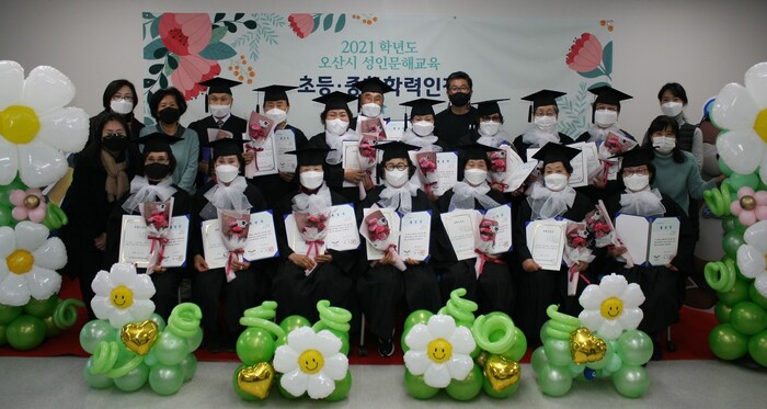 오산시(시장·곽상욱)는 16일 오산시평생학습관에서 2021학년도 오산백년한글학교 성인문해교육 초등.중학학력인정 졸업식을 개최했다고 전했다.