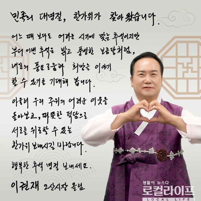 [오산=로컬라이프] 송준형 기자 = 이권재 오산시장은 추석 명절을 맞아 시민들에게 명절 인사를 전했다.