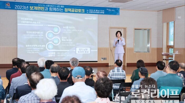 | ▲ 김보라 안성시장이 ‘보개면 정책공감 토크’에서 지역 발전 방안에 대해 설명하고 있다. (사진출처=김보라 페이스북) |
