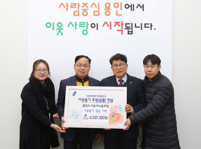 이날 장용찬 용인도시공사 노조 위원장과 직원들이 시를 찾아와 ‘사랑의 열차’에 성금 232만7320원을 기탁했다. 이 성금은 어려운 이웃을 돕기 위해 노조원들이 십시일반 모은 것이다.