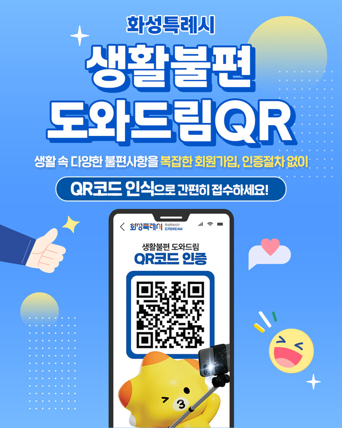 [화성=로컬라이프] 송준형 기자 = 화성특례시는 시민 여러분의 불편을 최소화하고, 신속하게 해결하기 위해 생활 속 민원을 간편하게 접수할 수 있는 ‘생활 불편 도와드림 QR’을 시작한다고 밝혔다.