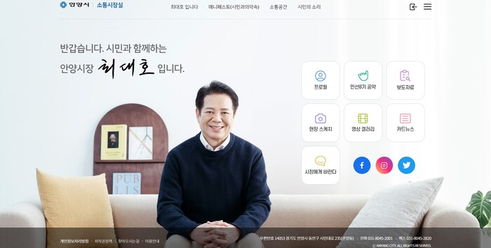 한편, 안양시는 시민 편의를 위해 소통시장실 홈페이지의 사진, 디자인 등을 개선하고 프로필, 민선8기 공약, 보도자료 등 주요 메뉴를 첫 페이지에 게시했다. 시민이 꼭 알아야 할 정보를 쉽게 전달하기 위한 ‘카드뉴스’ 페이지도 신설했다.