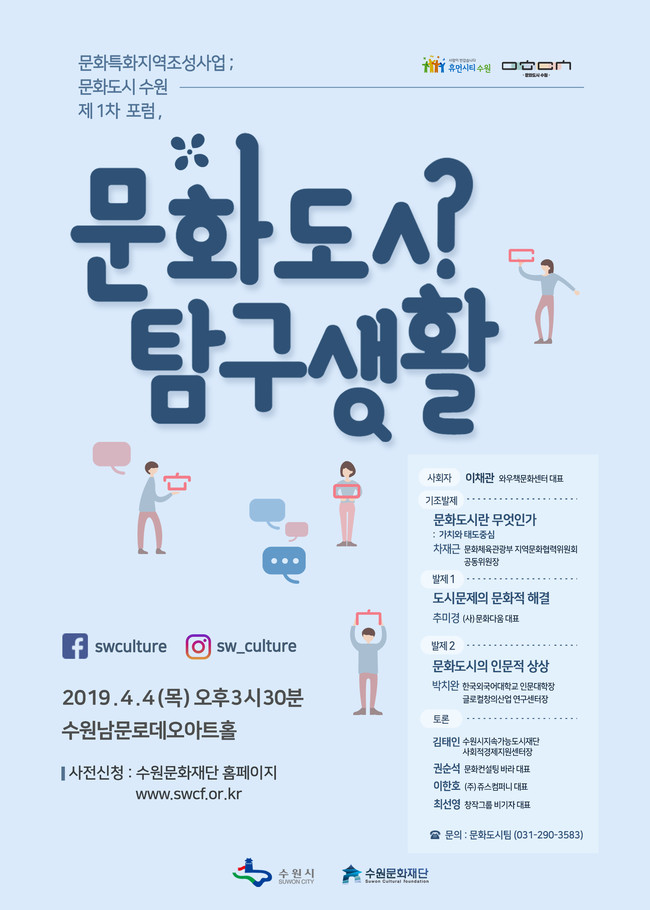수원문화재단은 오는 4일 오후 3시 30분부터 수원남문로데오아트홀에서 ‘문화도시 수원 1차 포럼-문화도시 탐구생활’을 개최한다.