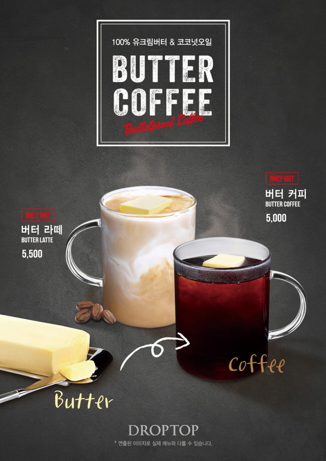 이번에 선보인 신메뉴는 미국에서 유행하고 있는 방탄커피를 드롭탑만의 차별화된 음료로 탄생시킨 버터커피&버터라떼와 가을, 겨울에만 즐길 수 있는 홍시주스&홍시라떼로 마련됐다.