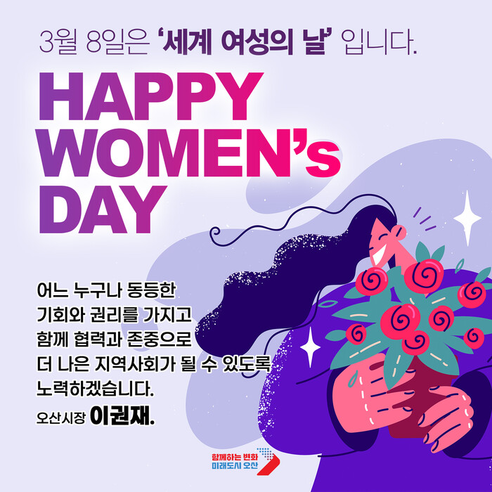 [오산=로컬라이프] 송준형 기자 = 이권재 오산시장은 8일, 자신의 페이스북을 통해 세계 여성의 날을 맞아 여러분 모두에게 따뜻한 인사를 전한다고 밝히며, 또한 우리 삶의 다양한 영역에서 빛나고 있는 여성들에게 응원과 격려도 보낸다고 전했다.