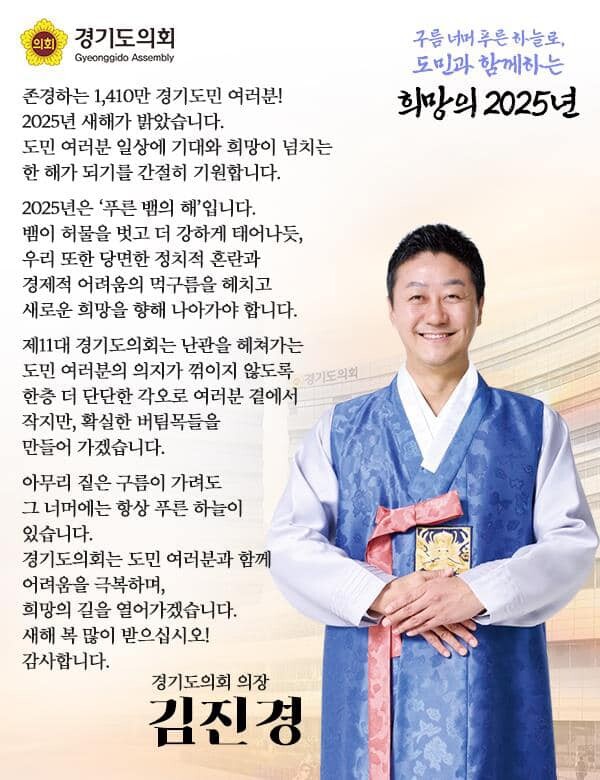 [경기=로컬라이프] 송준형 기자 = 김진경 경기도의회 의장은 1일, 자신의 페이스북을 통해 2025년에도 건강과 행복이 가득한 한 해 되시길 기원한다고 밝혔다.