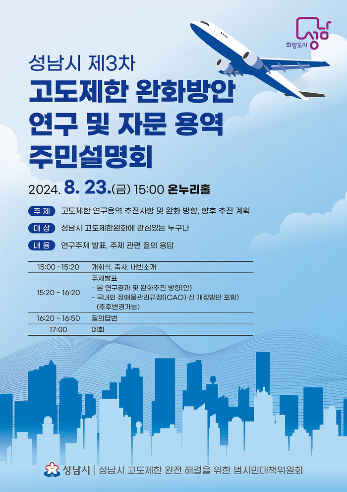 성남시(시장 신상진)가 23일 오후 3시 시청 온누리홀에서 ‘제3차 고도제한 완화방안 연구 및 자문 용역’에 대한 주민설명회를 개최한다.