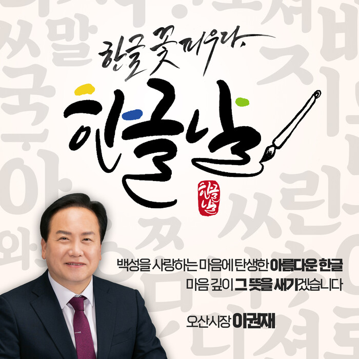 [오산=로컬라이프] 송준형 기자 = 이권재 오산시장은 9일, 자신의 페이스북을 통해 오늘 한글날을 맞아 백성을 사랑하는 마음 그 마음에서 탄생한 아름다운 한글 마음 깊이 그 뜻을 새기겠다고 강조했다.