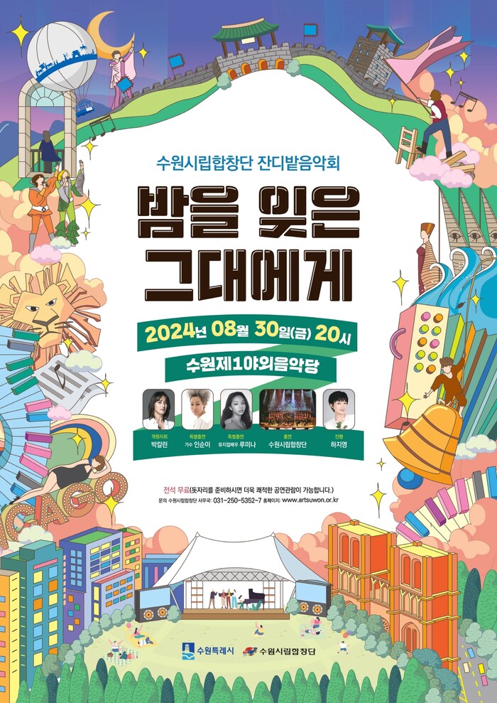 별도의 예약 없이 시민 누구나 무료로 관람할 수 있고, 돗자리를 준비하면 더 편안하게 공연을 즐길 수 있다. 자세한 내용은 수원시립예술단 홈페이지(http://www.artsuwon.or.kr)에서 확인할 수 있다.