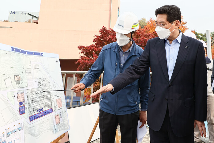 이상일 용인특례시장이 1일 개량사업 중인 기흥레스피아를 찾아 추진 현황을 점검하고 현장 직원들의 안전을 위한 시설물 설치를 지시했다.