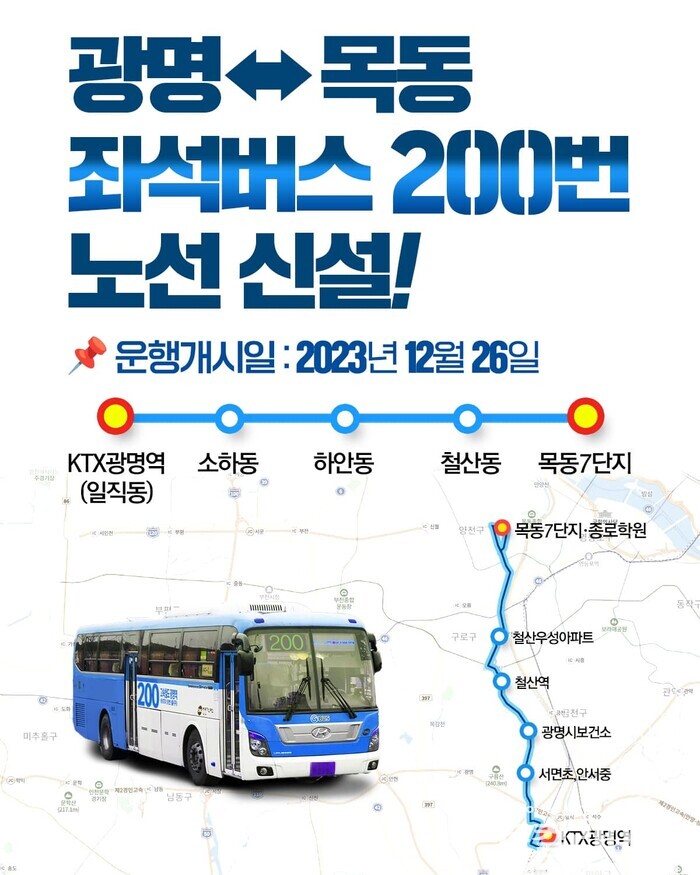 이와 관련해 박승원 광명시장은 7일, 자신의 페이스북을 통해 “KTX광명역-목동7단지 일반좌석버스 200번 신설 개통, 금년 12월 26일부터 광명-목동선이 운행된다”고 밝혔다.