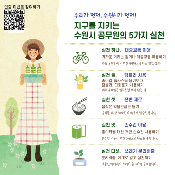 캠페인은 ‘가까운 거리는 걷거나 대중교통 이용하기’, ‘종이컵 대신 텀블러 사용하기’, ‘음식은 먹을 만큼만 담기’, ‘종이 타월 대신 손수건 사용하기’, ‘쓰레기 분리수거 철저히 하기’ 등 다섯 가지 실천을 중심으로 이뤄진다. 9월 한 달간 진행되며, 수원시 전 직원이 참여한다.
