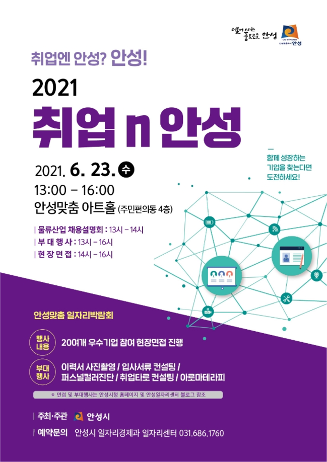 안성시는 오는 23일(수) 안성맞춤아트홀에서『2021 취업n안성』일자리박람회를 개최한다.
