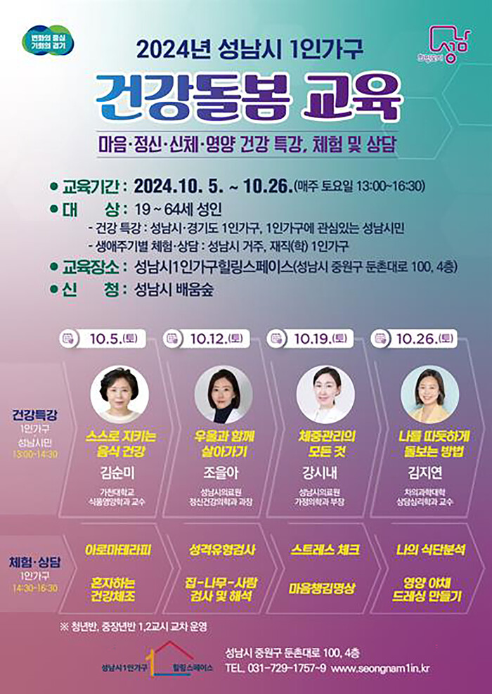 이번 프로그램은 혼자 사는 시민들의 건강 챙기기를 지원하기 위해 기획돼 ▲19일 강시내 성남시의료원 가정의학과 부장의 ‘체중 관리의 모든 것’ ▲26일 김지연 분당차병원 차심리상담센터장의 ‘나를 따뜻하게 돌보는 방법’ 등의 순으로 특강을 진행한다.