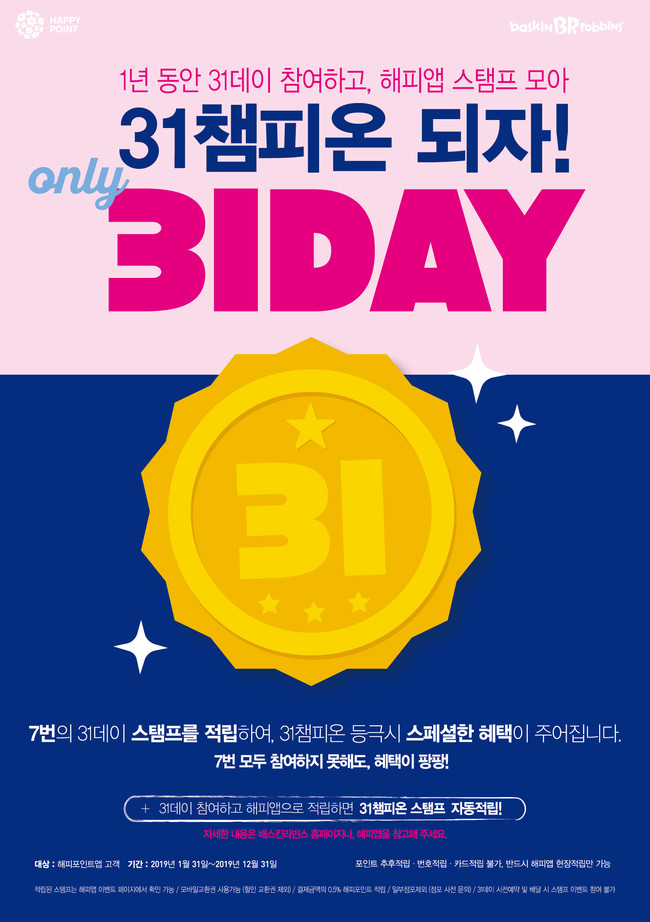 2019년 새해를 맞아 새롭게 도입하는 ’31스탬프 프로모션’도 함께 운영한다. ‘31DAY’ 프로모션에 참여한 뒤, 해피포인트 앱을 통해 포인트를 적립하면 ’31스탬프’가 자동으로 누적되는 행사다.