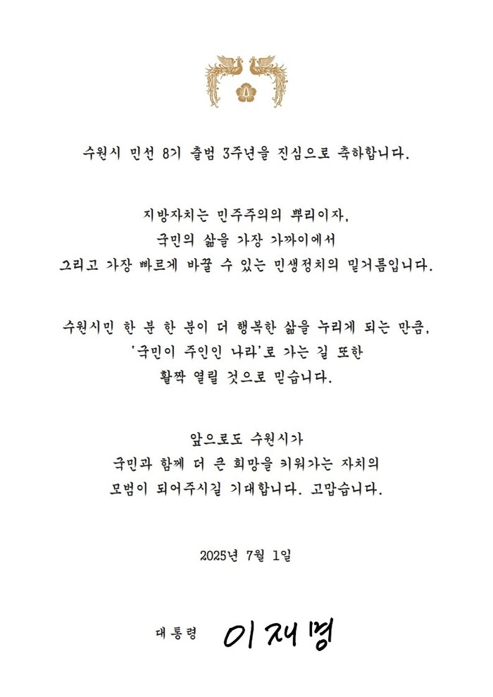 이날 도착한 편지는 수원시 민선 8기 출범 3주년을 축하하는 이재명 대통령님의 마음이 담긴 편지라며, 페이스북을 통해 밝혔다.