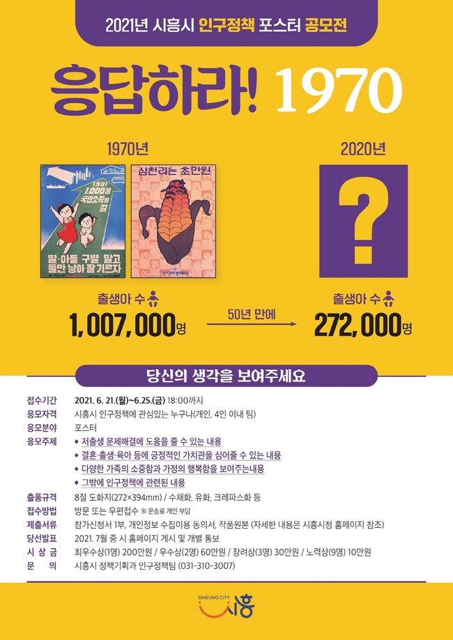 시흥시(시장 임병택)는 오는 25일까지 2021년 시흥시 인구정책 포스터 공모전”을 개최한다.