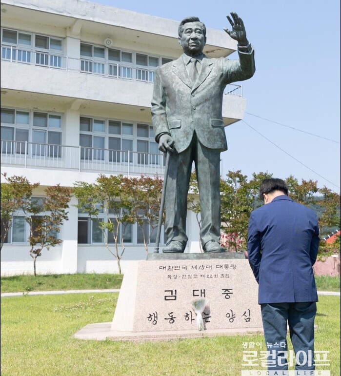 | ▲ 김동연 경기도지사가 옛 목포상고를 찾아 고 김대중 전 대통령 동상에 헌화, 참배하고 있다. (사진출처=김동연 페이스북) |