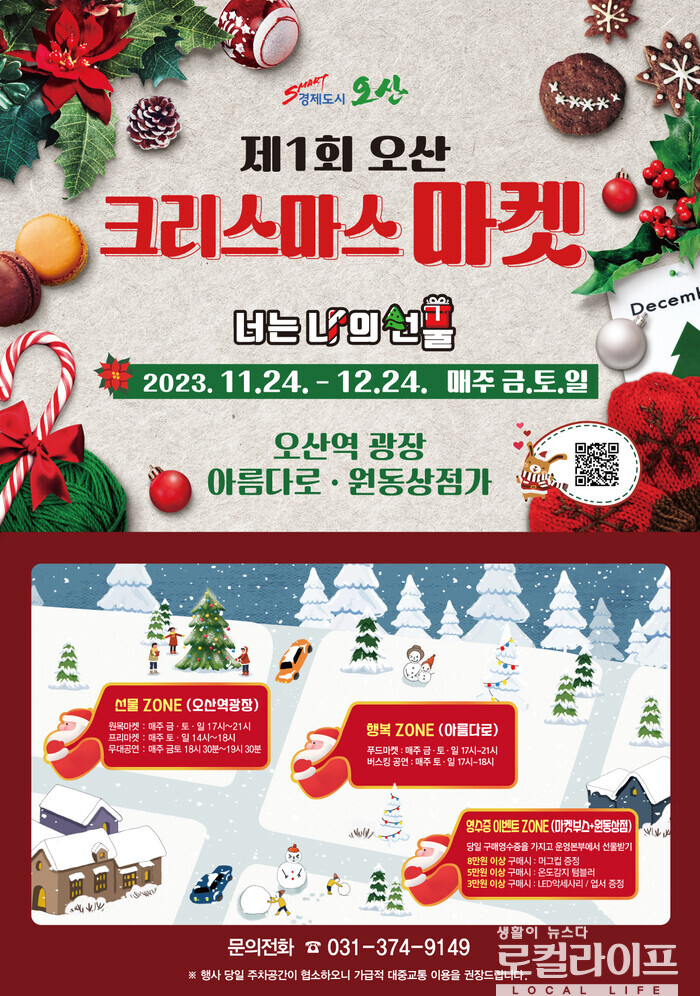 [오산=로컬라이프] 송준형 기자 = ‘제1회 오산 크리스마스마켓’ 행사가 “너는 나의 선물”을 주제로 11월 24일부터 12월 24일까지 한달 간 오산역 광장과 아름다로 상점가, 원동상점가 일원에서 열린다.