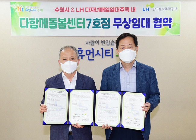 협약에 따라 LH는 장안구 송죽동에 있는 LH 다자녀매입임대주택 1층 제1종 근린생활시설 공간(159㎡)을 수원시에 10년 동안 무상 임대한다. 수원시는 임대한 공간을 다함께돌봄센터 7호점으로 조성할 예정이다. 수원시는 건물 유지·관리·보수 비용만 부담한다.