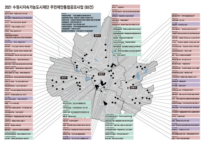 또 수원시지속가능도시재단이 주관하는 사업은 93개다. ▲새내기 마을공동체 활동을 지원하는 ‘마을공동체 씨앗’ 사업 31개 ▲마을공동체 역량을 강화하는 ‘마을공동체 성장’ 23개 ▲마을 생태계 보전·복원 활동을 하는 ‘물환경’ 8개 ▲도시재생사업과 연계된 마을공동체 활동을 하는 ‘도시재생’ 19개 ▲마을미디어 활동을 지원하는 ‘마을미디어’ 12개 사업 등이다.