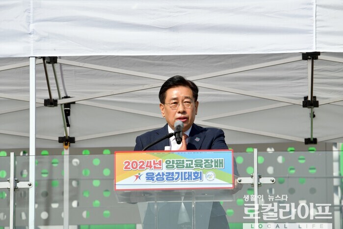 | ▲ 전진선 양평군수가 ‘2024년 양평교육장배 육상경기대회’에 참석해 축사를 하고 있다. (사진출처=전진선 페이스북) |