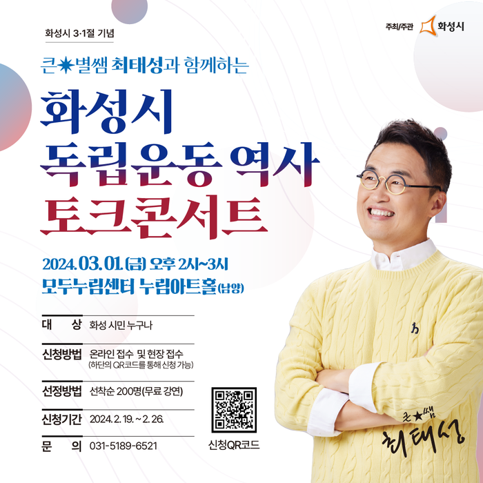 오는 3월 1일 오후 2시 모두누림센터 누림아트홀에서 열리는 이번 토크콘서트는 대한민국 대표 역사 강사인 최태성 강사가 강의를 맡아 1919년 화성지역 독립운동을 시민들에게 생생하고 흥미롭게 전달할 예정이다.
