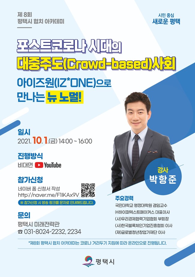 이번 제8회 협치 아카데미는 코로나 거리두기 4단계 지침에 따라 평택시 유튜브로 생중계될 예정이다. 관심 있는 시민은 누구나 사이트(http://naver.me/F1IKAx9V)를 통해 신청가능하다.