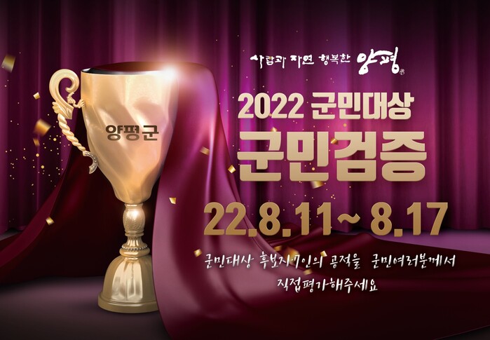 양평군(군수 전진선)이 군 최고 영예의 상인 ‘2022년 양평군 군민대상’ 후보자에 대한 평가를 홈페이지를 통해 군민에게 직접 검증받는다.