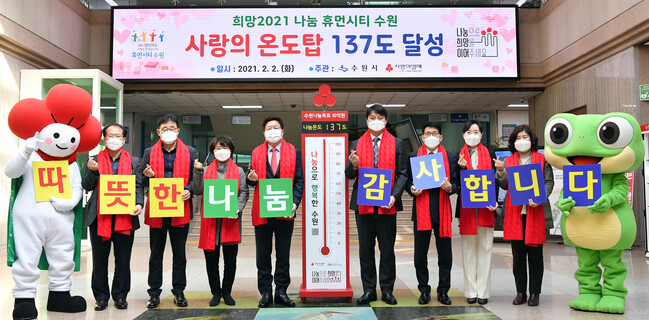 수원시와 경기사회복지공동모금회는 지난해 12월 3일 ‘사랑의 온도탑’을 설치하고, ‘희망 2021 나눔 캠페인’을 시작했다. 사랑의 온도탑은 1000만 원이 모금될 때마다 1℃씩 올라간다.