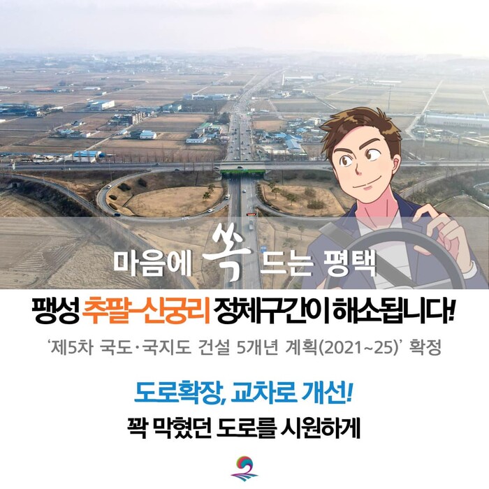 2일, 정 시장은 자신의 페이스북을 통해 국도 45호선 확장사업의 일환으로 팽성읍 남산리 추팔산업공단 사거리에서 신궁교차로까지 1.47km 구간을 기존 4차로에서 6차로로 확장하게 된다며 이같이 전했다.