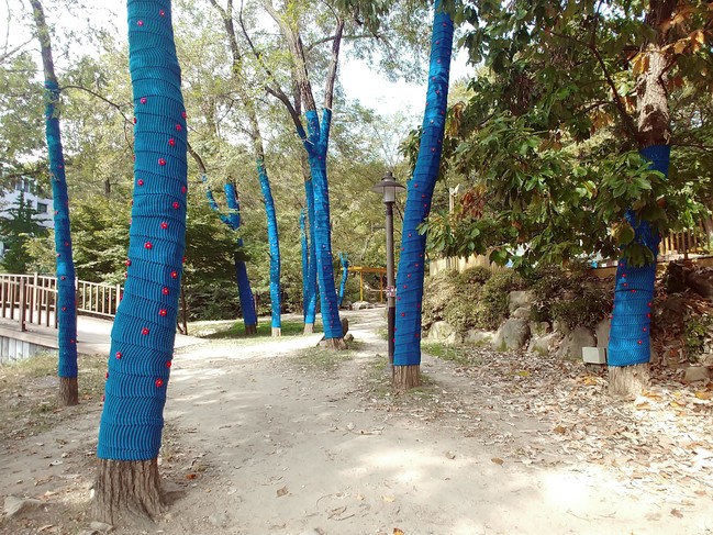 털실 옷 가로수길이 조성된 구간은 예술공원 입구에서 팔각정 뒤편 주차장까지 2.8km에 이른다. 총 8개 구간으로 조성됐는데 지난해보다 3구간이 늘었다. 가로수 460여 그루의 털실 옷 조성 및 전시는 내년 3월까지 계속된다.