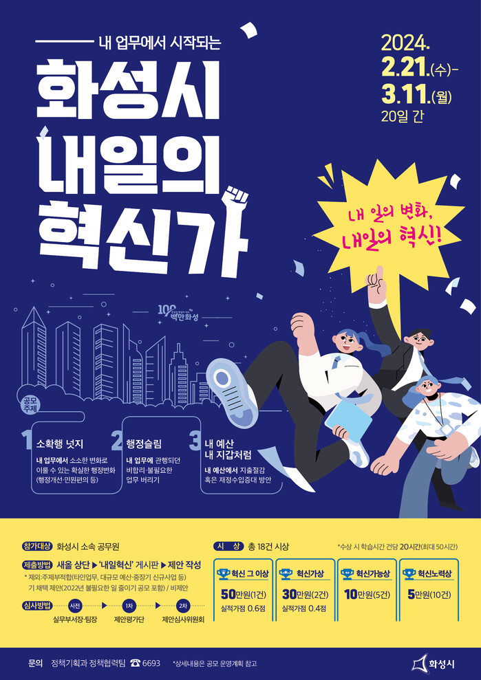화성시(시장 정명근)가 화성시 공직자를 대상으로 ‘내 일의 변화, 내일의 혁신!’을 주제로 ‘화성시 내일의 혁신가’ 공모를 추진한다.