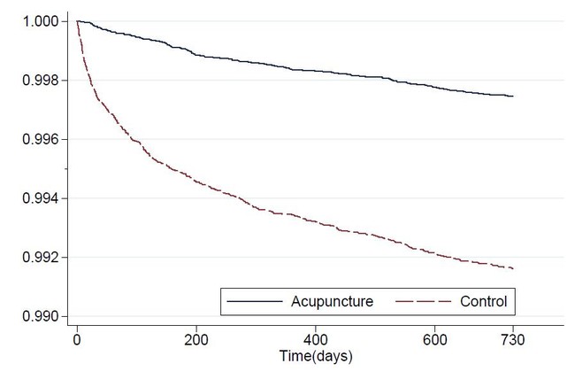 카플란 메이어(Kaplan-Meier) 생존분석에서도 침군이 대조군 보다 어깨수술 시행률에 있어서 높은 누적생존율을 보였다. 해당 연구의 누적생존율은 시간이 지나면서 곡선이 누적생존율 1.0에서 떨어질수록 수술을 받은 인원이 늘어남을 의미한다. 침군의 누적생존율은 시간의 경과에 따라 대조군 보다 완만하게 떨어지는데, 이는 침군의 어깨수술률이 대조군 보다 낮다는 것을 의미한다. 카플란 메이어 생존분석은 사건이 발생한 시점마다 구간생존율을 구해 누적생존율을 추정한다.