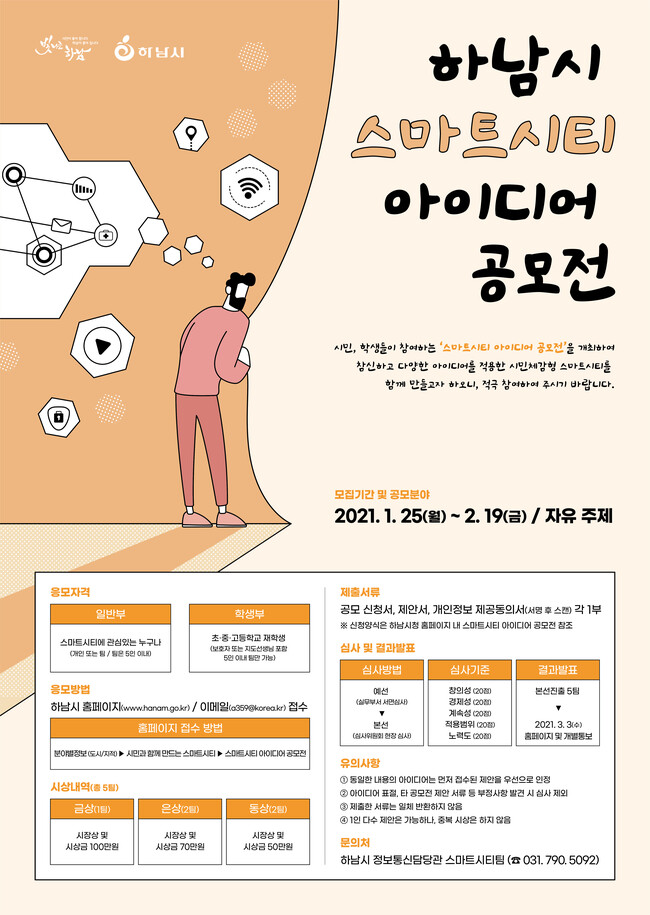신청은 2월 19일까지 신청서와 제안서 등 구비서류를 작성해 하남시 홈페이지 또는 이메일(a359@korea.kr)로 접수하면 된다. 서식은 홈페이지 내 스마트시티 아이디어 공모전 메뉴에서 내려 받을 수 있다.