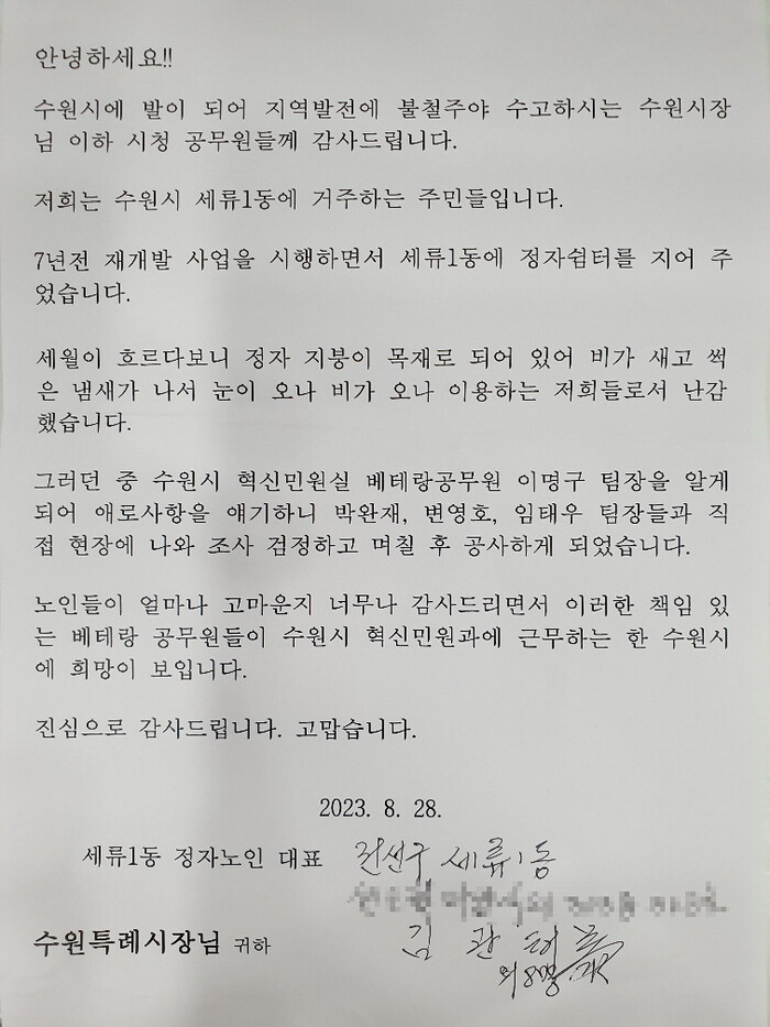 지난 8월 28일 이재준 수원특례시장 앞으로 한 통의 편지가 왔다. 발신인은 ‘세류1동 정자 노인 대표 김관태 외 8명’이었다.