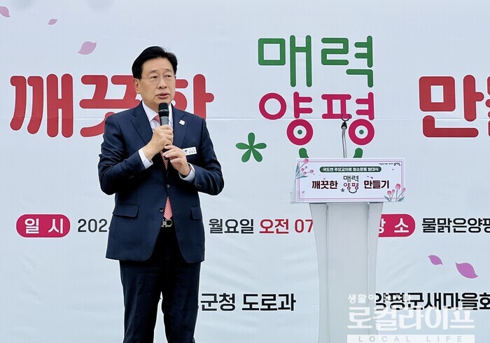 | ▲ 전진선 양평군수가 ‘양평군 새마을회 국도변 정화활동’에 참석해 인사말을 하고 있다. (사진출처=전진선 페이스북) |