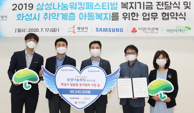 이날 열린 복지기금 전달식에서 삼성전자는 ‘2019 화성시와 함께하는 「삼성나눔워킹 페스티벌」’에서 조성된 복지기금 98,540,000원을 전달했다.