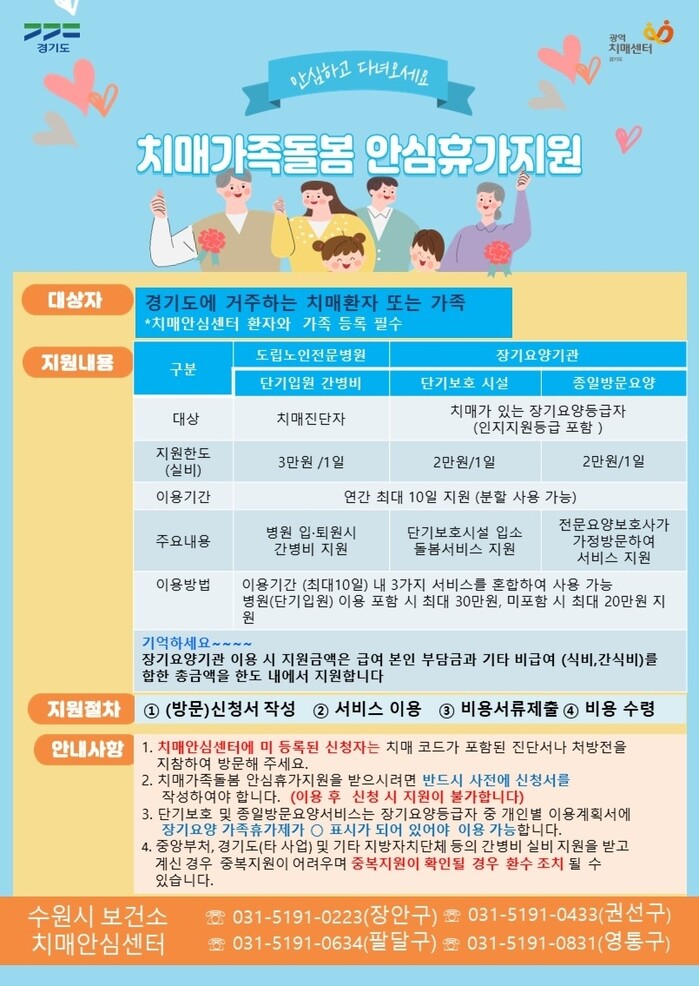 수원시보건소가 치매 환자를 돌보는 가족의 심리·육체적 회복을 돕는 ‘2026년 치매가족돌봄 안심휴가지원’ 사업을 연중 운영한다.