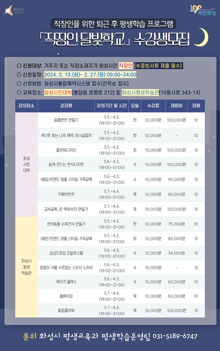 화성시(시장 정명근)가 2024년 직장인 달빛학교 수강생을 오는 13일부터 27일까지 선착순 모집한다.