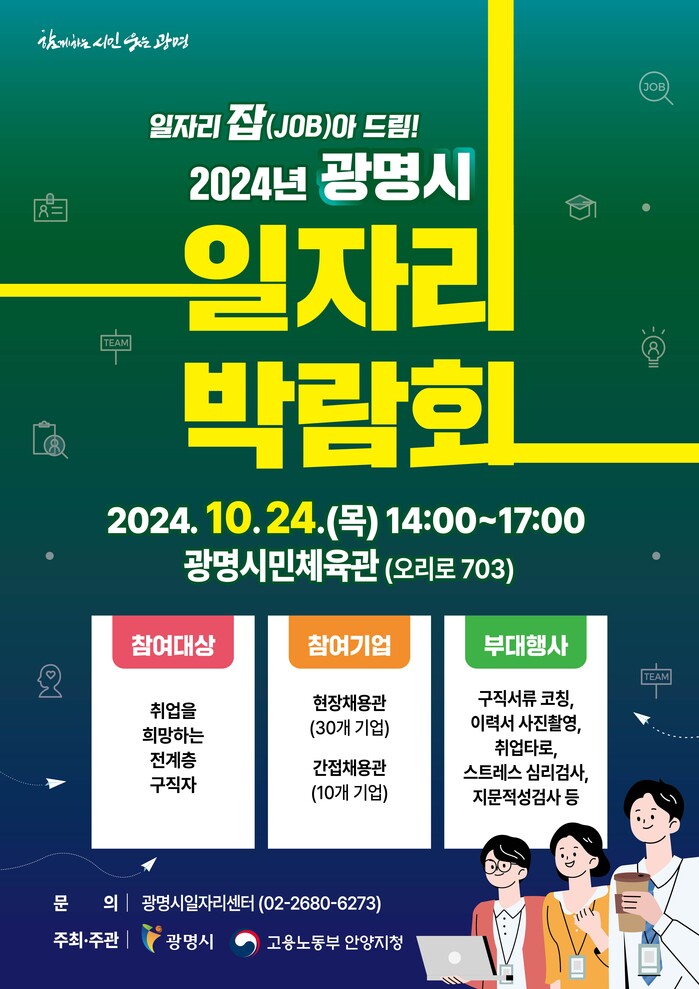 광명시(시장 박승원)는 오는 24일 오후 2시부터 5시까지 광명시민체육관에서 일자리 활성화를 위한 ‘일자리 잡(job)아 드림!’ 2024년 광명시 일자리박람회’를 개최한다.