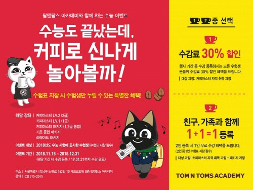 커피전문점 탐앤탐스는 수험생을 대상으로 오는 12월 31일까지 커피 교육기관 ‘탐앤탐스 아카데미’에서 커피 강좌 이벤트를 진행한다. 수험생과 수험생의 친구 또는 부모님까지 함께 할 수 있는 이벤트로 직접 만든 커피를 즐기며 지친 마음을 힐링 하기 위한 취지로 마련됐다