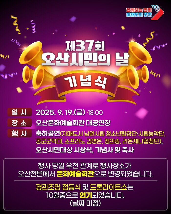 이와 관련해 이권재 오산시장은 17일, 자신의 페이스북을 통해 제37회 오산시민의 날 기념식을 당초 오산천변에서 시민 여러분과 함께 아름다운 경관 속에 축하의 장을 마련하고자 하였으나 행사 당일 비 예보로 인해 부득이하게 행사 장소를 오산문화예술회관 대공연장으로 변경하게 되었다고 밝혔다.