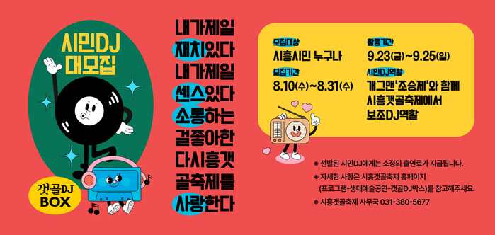 시흥시(시장 임병택)가 오는 9월 23일부터 25일에 열리는 시흥갯골축제의 ‘갯골DJ박스’에서 갯골DJ와 함께할 시민DJ 참여자를 모집한다.