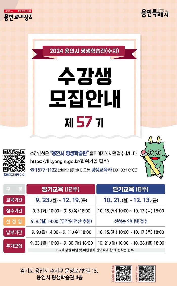 용인특례시(시장 이상일)는 9월 3일부터 5일까지 평생학습관(수지)의 ‘제57기 정기교육프로그램‘ 수강생을 모집한다고 26일 밝혔다.