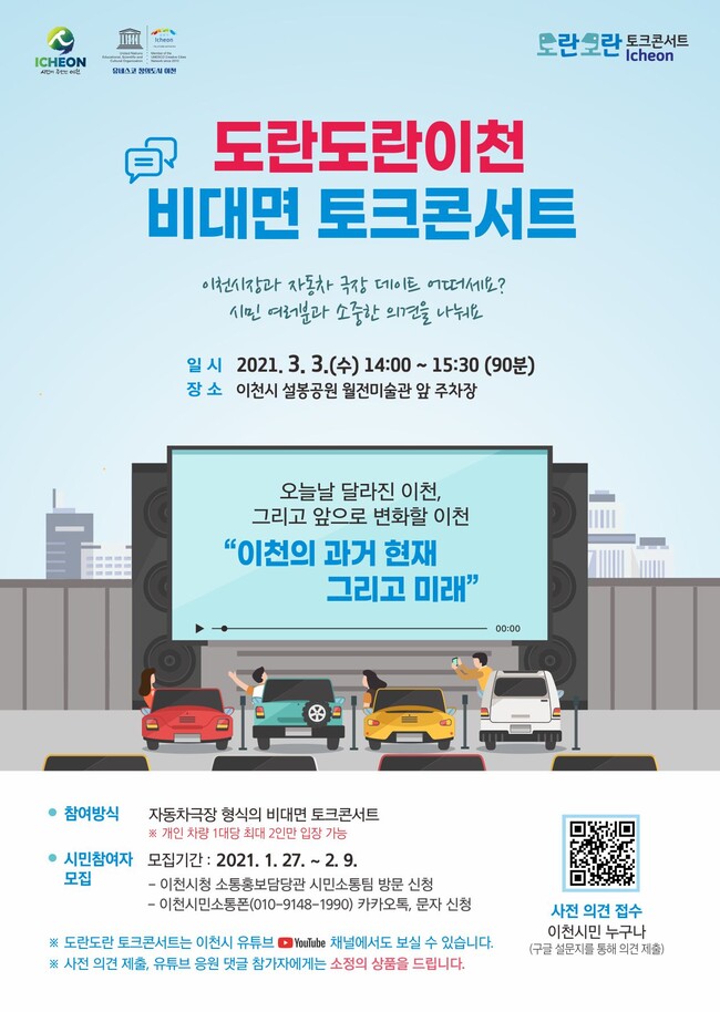 [로컬라이프] 이천시(시장 엄태준)는 3월 3일 오후 2시 설봉공원 월전미술관 앞 주차장에서 이천의 과거 현재 그리고 미래를 주제로 도란도란 비대면 토크콘서트를 개최한다.