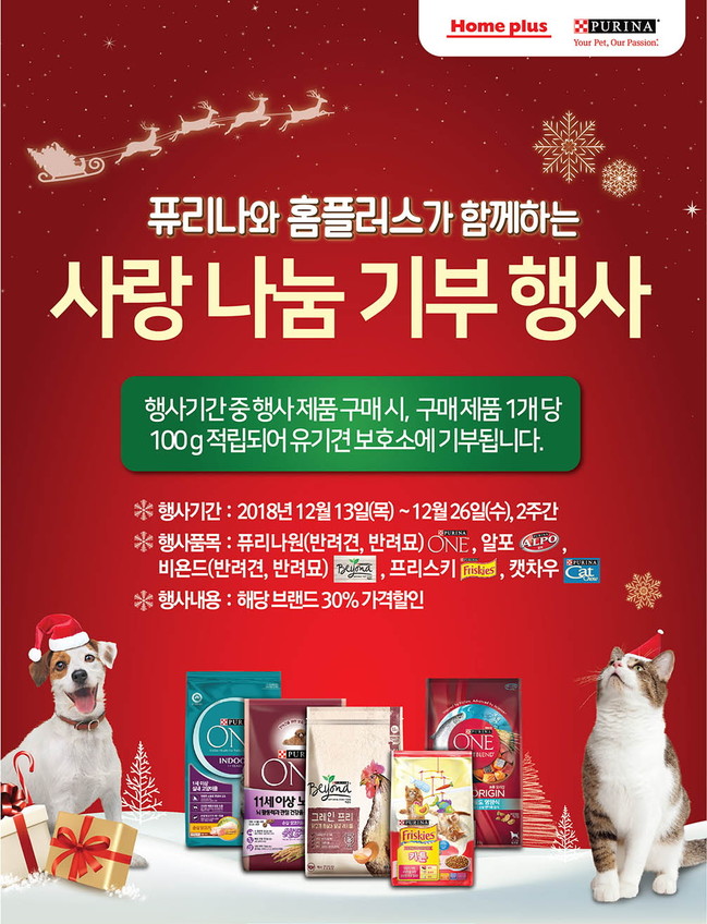 세계적인 반려동물 식품 전문 기업 네슬레 퓨리나가 홈플러스와 ‘사랑나눔 기부행사’를 오는 13일부터 26일까지 약 2주간 진행한다.